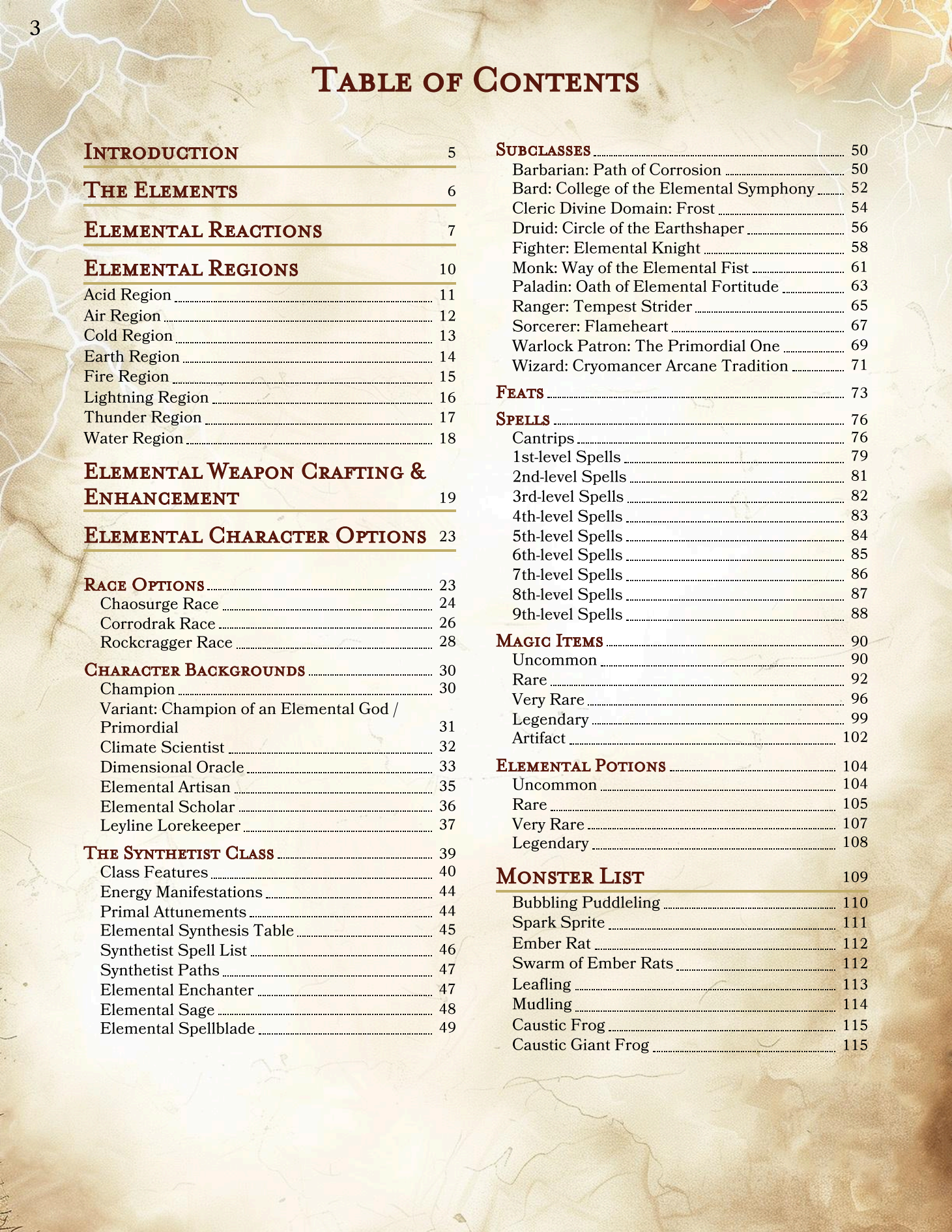 Elemental Races, Classes, and Subclasses: Discover races like Chaosurges, Corrodraks, and Rockcraggers. Explore new subclasses and the versatile Synthetist class, mastering elemental energies in powerful ways.