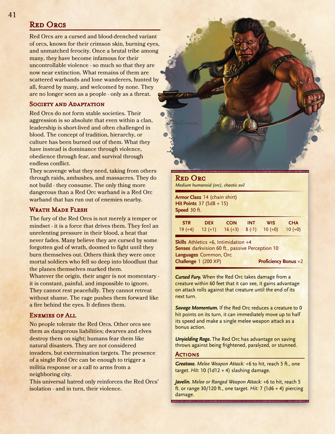 - Dozens of Orc Statblocks – From the Orc Bannerbearer to the Red Orc Warlord, every entry includes lots of extra traits and variant abilities to let you customize encounters.