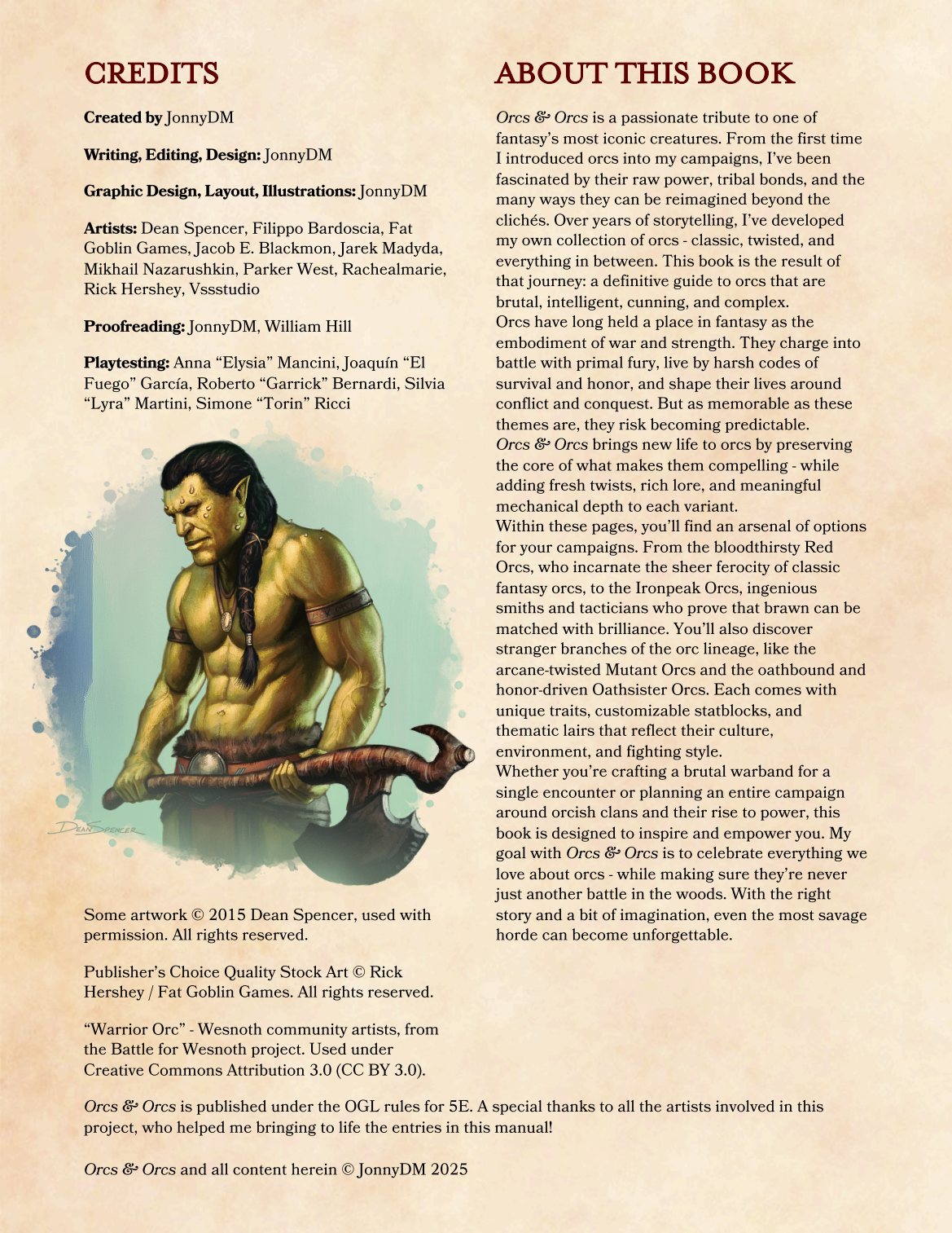 Orcs are fierce, relentless, and far more than just brutes with axes. Orcs & Orcs is your complete guide to unleashing the full fury and complexity of orc-kind at your table - from classic raiders to arcane mutants, oathbound warriors, and brutal chieftains.