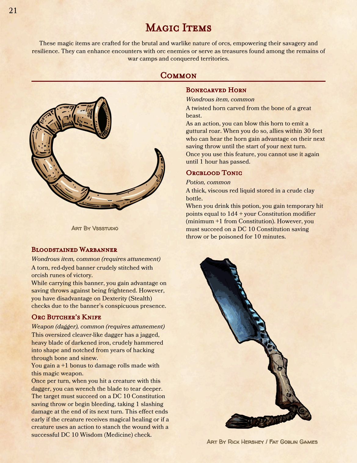 - 70 Magic Items – Brutal, spiritual, and crafted artifacts tailored to the orc lifestyle - from cursed red orcs' axes to tribal relics of power.